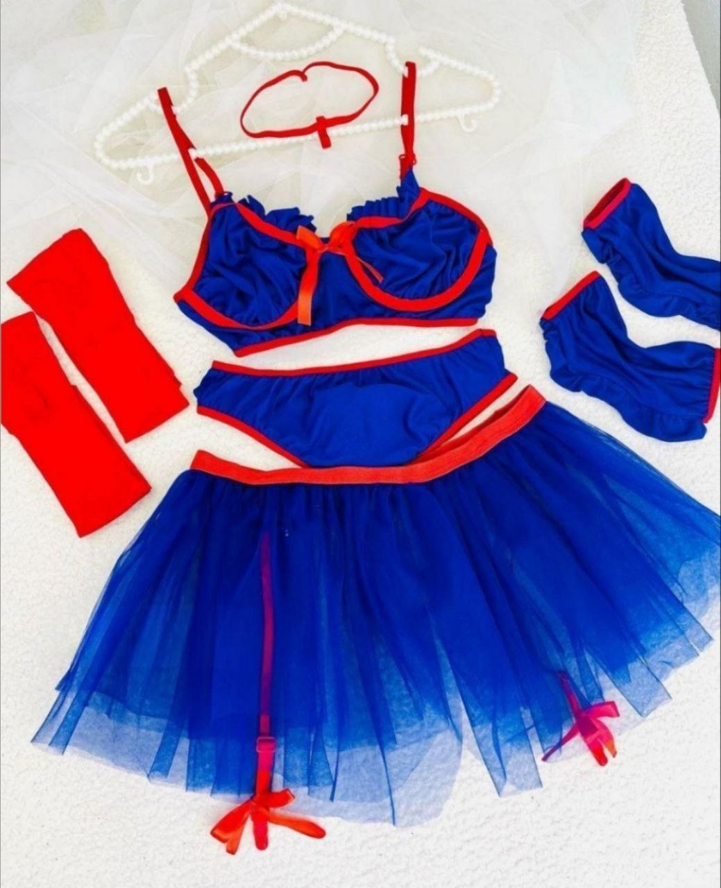 ست فانتزی شامل سوتین فنردار /دامن /جوراب قرمز/ شورت/ گردنبند /بازوبند❤️ فری سایز 36 تا 42