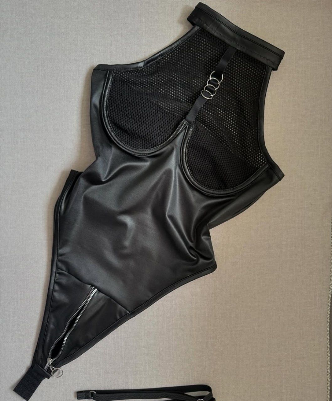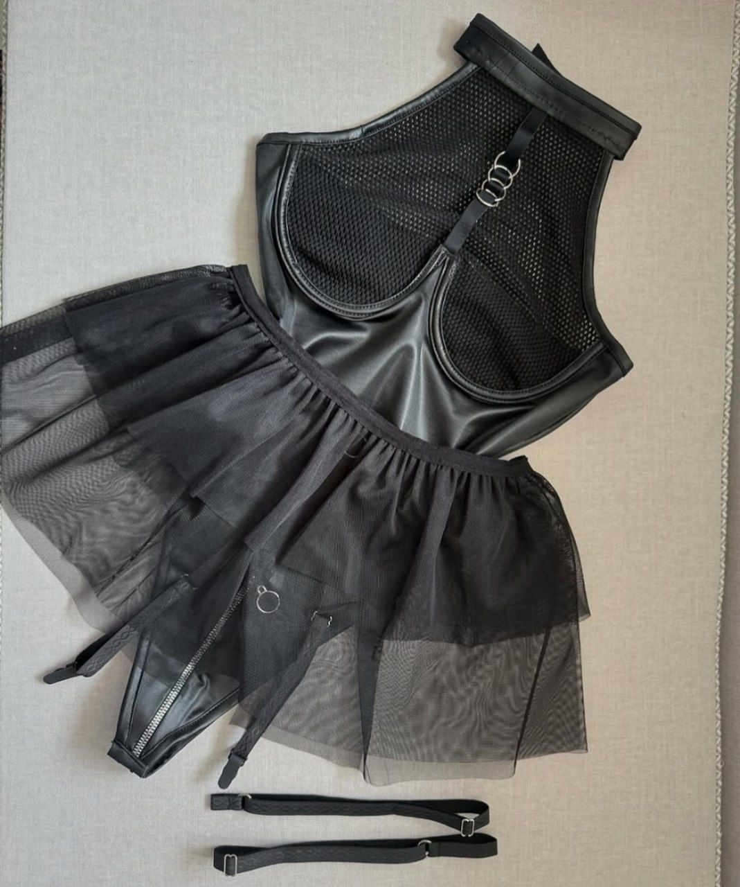 ست فانتزی. بادی چرم فاق زیپدار همراه با دامن توری. سایز بندی داره سایز لارج مناسب 36 تا 40. سایز ايکس لارج مناسب 42 و 44